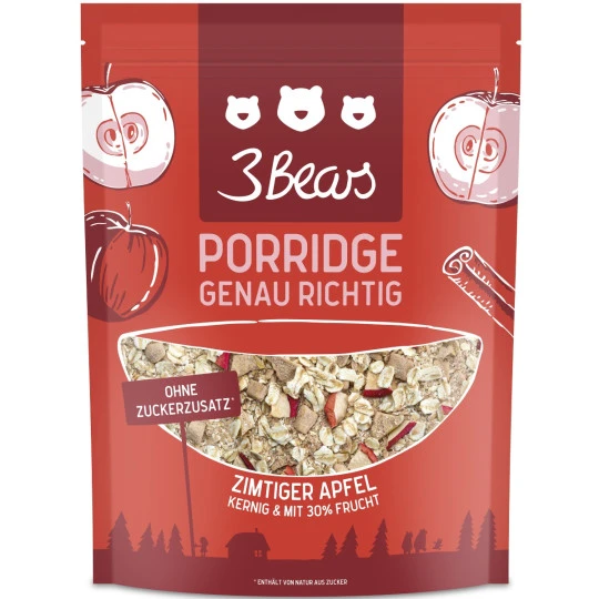 Der Bären liebstes Porridge! Voll gepackt mit aromatischen Äpfeln und vollendet mit etwas Zimtstaub zauberst du dir die Obstwiese auf deinen Küchentisch. Zimtiger Apfel vereint dreierlei Apfelzutaten – gehackte Apfelringe, Apfelchips und natürliches Apfelmehl – und bekommt so einen fabelhaft vollen und aromatischen Apfelgeschmack. Verfeinert mit der genau richtigen Menge an süßem Zimt ist Zimtiger Apfel einfach nur bärenstark.