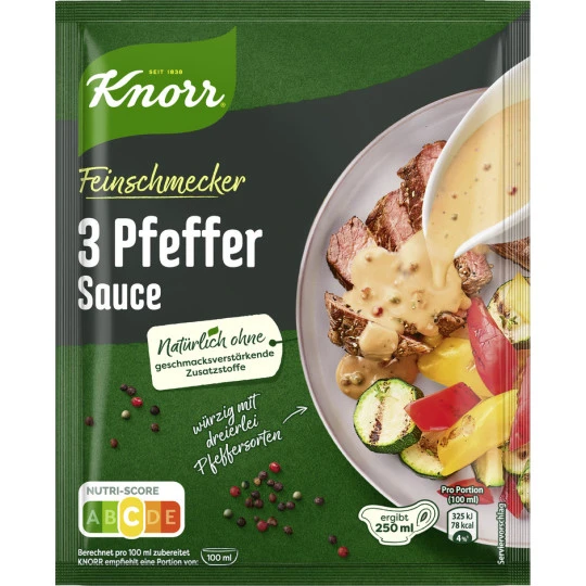 3 Pfeffer Sauce ist eine fein abgestimmte Saucenkomposition mit einem angenehm scharfen Geschmack und grünem, schwarzen und weißen Pfeffer. Diese würzige Pfeffersauce passt ideal zu allem Kurzgebratenem, wie Schweinemedaillons, Steaks, Frikadellen, Schnitzel, Wild oder Geschnetzeltem. KNORR Feinschmecker Saucen bieten für jeden Geschmack die passende Saucenidee.